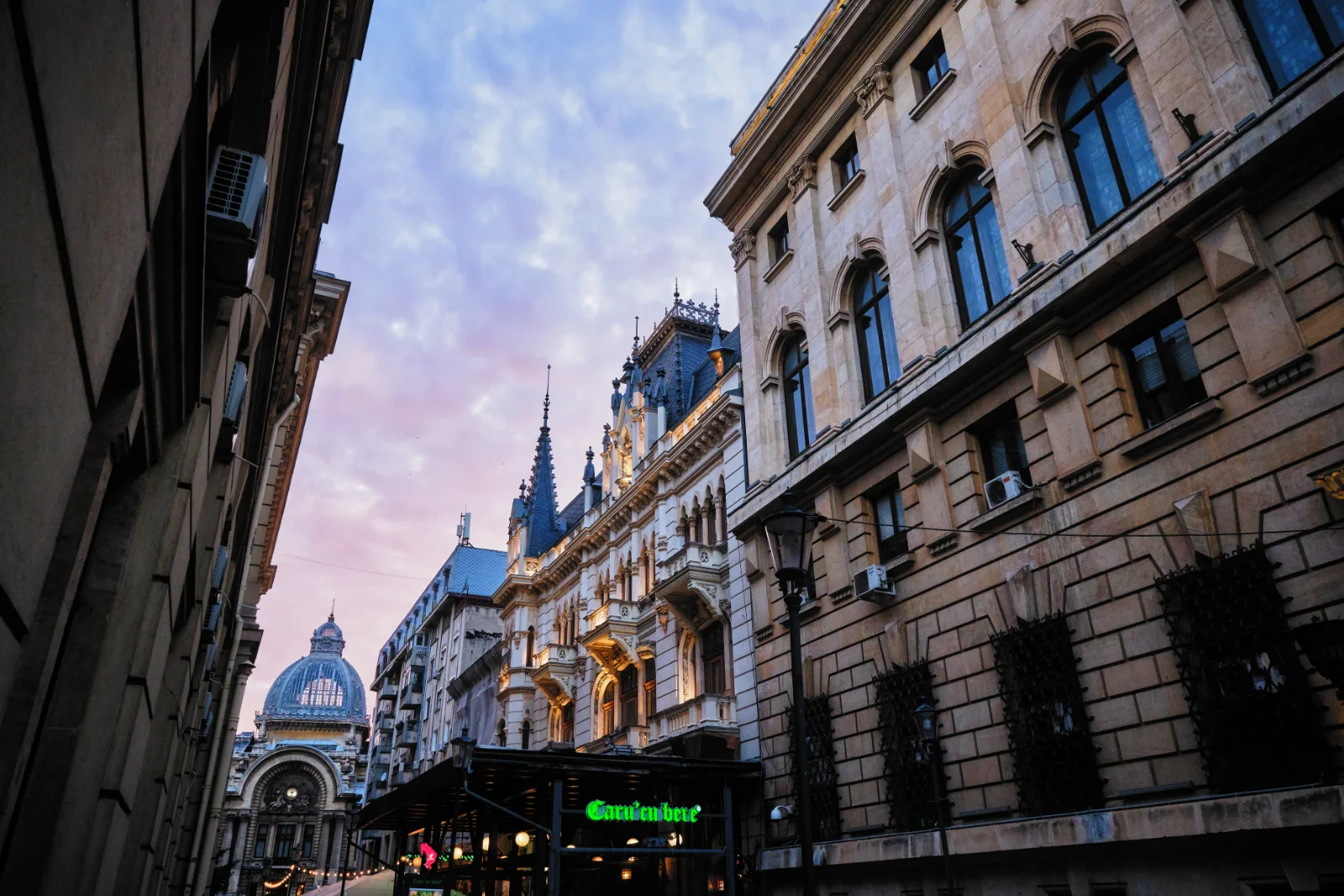 Bucharest Old Town (Old Center as it’s known by locals) covers an area of approximately 0,5 sq. km., located between Queen Elizabeth and Carol I boulevards to the north, Hristo Botev Boulevard to the east, Corneliu Coposu Boulevard, Halelor Street, and Splaiul Independentei to the south, while Victory Avenue encloses it to the west. Our walk through its enchanting streets reveals exceptional historical and architectural treasures, but also a vibrant atmosphere that truly comes alive in the evening. During the busiest summer months, the cobblestone streets and alleys become crowded with people. While most travelers arrive in Bucharest’s Old Town for its vibrant restaurants and bars, there are also plenty of interesting monuments to discover.