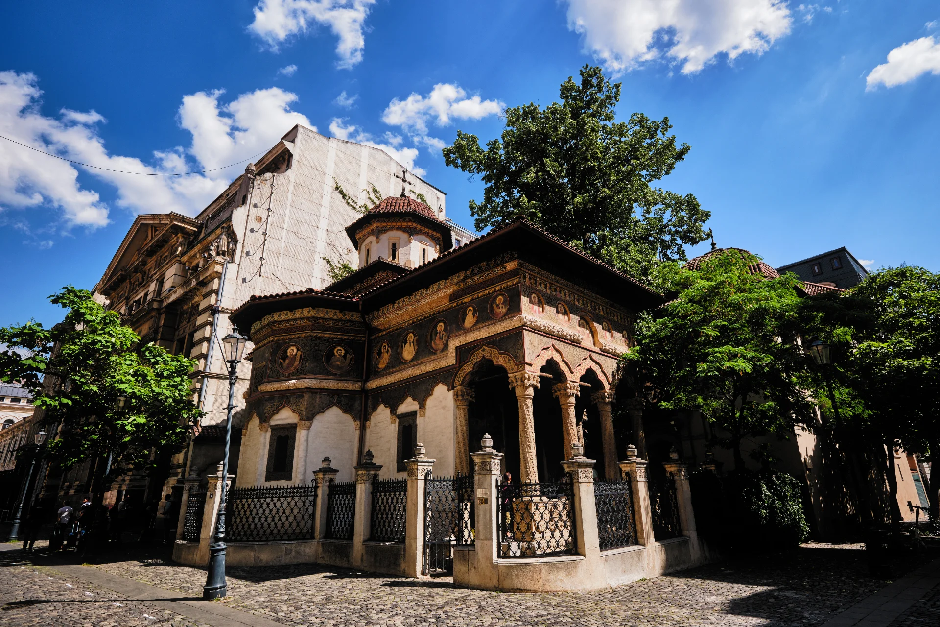 Right in front of the church we can admire one of the oldest and most famous inns of Bucharest. Manuc’s Inn (Hanul lui Manuc) is still preserving much of its authentic aspect and was built in 1808 by a wealthy Armenian entrepreneur. It is the oldest hotel-type building in Bucharest and has housed important historical events. Still on French Street, a little to the west, we can also visit the beautiful St. Demetrius – Post Church, dated in 1819 and featuring several holy relics, as well as the only old icon of St. Judas Tadeo in Bucharest. A few steps to the north along the rear walls of the National History Museum, there is one of the most beautiful churches in the city. The Stavropoleos Monastery Church features a superb traditional Brâncovenesc style and houses the largest collection of Byzantine music books in Romania. It was built in 1724 by a Greek monk that owned an inn, both the monastery and the inn being demolished by the end of the 19th century.